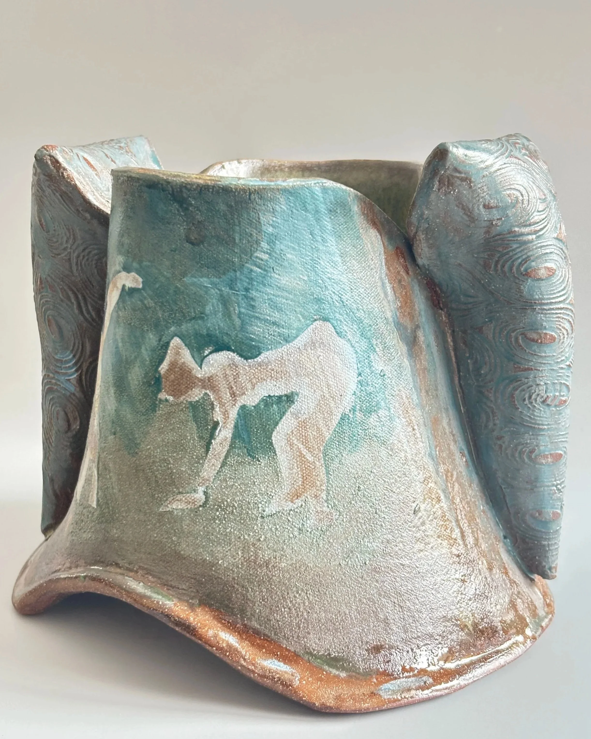 I use silhouette cut-outs with glaze and underglaze decoration. The cut-outs provide shadows and blank places where the clay body is animated with figure shapes from photographs, drawings, and sculpture. I have drawn the shapes as silhouettes to allow interplay with shape texture and colour on my hand made forms.